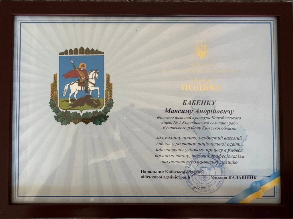 Голова Київської обласної військової адміністрації Микола Калашник нагородив вчителя фізичної культури Максима Андрійовича Бабенка за вагомий внесок у розвиток спорту серед дітей.